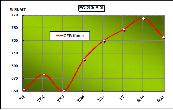 CFR Korea 734-736달러 … PTA 하락에 중동산 유입으로 MEG 가격은 8월 셋째 주에 CFR Korea 톤당 735달러로 30달러 하락했다.아시아 MEG(Monoethylene Glycol) 가격은 에틸렌(Ethylene) 가격 상승에도 불구하고 중동산 유입과 다운스트림 가격 하락의 영향으로 4주 만에 하락세로 전환돼 700달러 초반으로 내려앉았다. 에틸렌 가격은 국제유가와 나프타 가격 상승에 힘입어 976달러로 상승했으나 PTA(Purified Terephthalic Acid) 가격이 5일 연속 하락했기 때문이다. 여기에 PetroRabigh가 Rabigh Sunshine호를 통해 8월 계약물량을 공급했고 9월 물량이 추가 유입될 것으로 알려지면서 MEG 가격 하락 요인으로 작용했다.