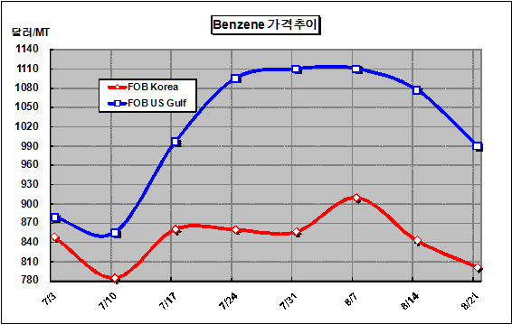 FOB Korea 801달러 형성 … FCFC의 No.3 BTX 컴플렉스 화재도 무위 벤젠 가격은 8월 셋째 주에 FOB Korea 톤당 801달러로 42달러 하락했다.아시아 벤젠(Benzene) 가격은 국제유가 및 나프타(Naphtha) 가격 상승에도 불구하고 수요 부진으로 2주 연속 하락해 800달러마저 위태롭게 됐다. 나프타 가격은 국제유가 강세에 힘입어 653달러로 42달러 상승했으나 미국 및 유럽 가격 하락으로 수출 수요가 줄어들었기 때문이다. 그러나 톨루엔(Toluene) 가격은 798달러는 4.5달러 하락함으로써 벤젠-톨루엔 스프레드가 마이너스로 전환되면서 수익성이 악화되고 있다.