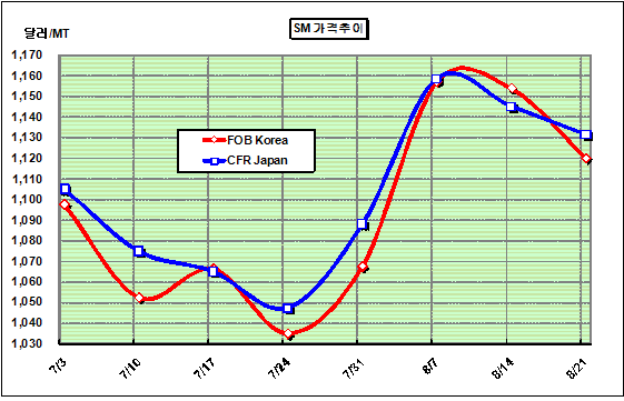 FOB Korea 1121달러로 34달러 하락 … 중국 장난감 50% 파산 SM 가격은 8월 셋째 주에 FOB Korea 톤당 1120달러로 34달러 하락했다.아시아 SM(Styrene Monomer) 가격은 업스트림 벤젠(Benzene) 가격 하락과 수요 감소로 2주 연속 하락해 1100달러 초반으로 주저앉았다. 국제유가가 배럴당 74달러 안팎으로 치솟고 나프타(Naphtha) 가격이 600달러 중반으로 올라섰지만 벤젠 가격이 800달러로 추락했기 때문이다. 여기에 역외물량 1만4000톤이 유입되면서 SM 재고가 5만톤을 상회하고 있는 상태에서 ABS(Acrylonitrile Butadiene Styrene), PS(Polystyrene), EPS(Expandable PS) 실수요가 크게 늘어나지 않고 있기 때문이다.