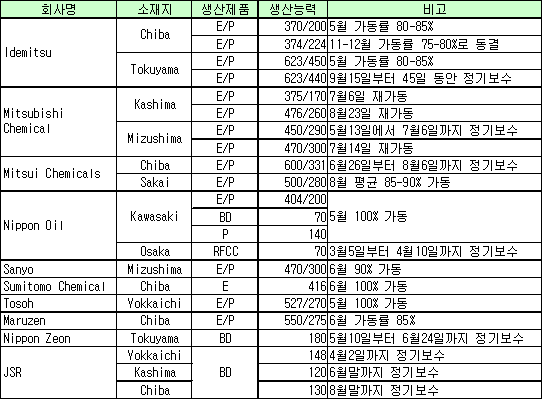 MitsuiㆍMitsubishi 정기보수 완료에도 … Idemitsu는 9월말 가동중단 일본이 올레핀 크래커 가동률이 곤두박질쳤다.올레핀 가격이 상승하고 있는 가운데 8월부터 일부 크래커가 재가동에 들어가고 있으나 9-10월까지 정기보수가 봇물을 이루고 있기 때문이다. Mitsubishi Chemical은 Kashima 소재 No.1 크래커의 정기보수를 연장해 7월6일 재가동하고, No.2 크래커는 6월28일부터 8월14일까지 정기보수하려 했으나 7월7일부터 7주 동안 정기보수를 완료하고 8월23일 재가동한 것으로 알려지고 있다. 에틸렌(Ethylene) 생산능력이 47만톤에 달하는 Mizushima 크래커는 7월14일 재가동한 바 있다.