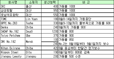 Nippon Steel은 Oita 소재 19만톤 플랜트의 가동률을 8월1일부터 80% 수준으로 감축했으며, Denka도 Chiba 소재 24만톤 플랜트의 가동률을 9월 한달동안 90% 수준으로 가동할 방침이다.