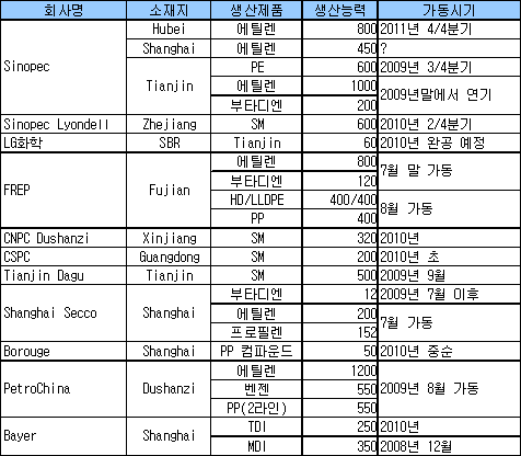 LG화학은 Tianjin에 SBR(Styrene Butadiene Rubber) 플랜트는 2010년 완공할 예정이나 아직 계획 상태에 머무는 등 2009년 하반기 시황에 따라 추가 연기가 불기피한 것으로 알려지고 있다. <이연숙 기자> 표, 그래프: | 중국의 올레핀 크래커 신증설 현황 | <화학저널 2009/8/31> |