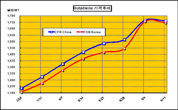 FOB Korea 톤당 1720-1730달러 형성 … Fujian 가동 하락세 전환 부타디엔(Butadiene) 가격이 하락세로 전환했다.아시아 부타디엔 가격은 9월11일 CFR China 톤당 1735-1745달러로 전주대비 5달러 하락하며 14일간 지속된 폭등세를 종료했다. 타이완 가격은 전주대비 10달러 하락해 CFR Taiwan 톤당 1735-1745달러에 머물렀고 FOB Korea도 톤당 1720-1730달러 수준에서 보합세를 나타냈다. 중국 FREP(Fujian Refining & Petrochemical)의 상업가동으로 중국의 부타디엔 수입에 영향이 예고되면서 구매가 일시적으로 급감했기 때문으로 해석된다.