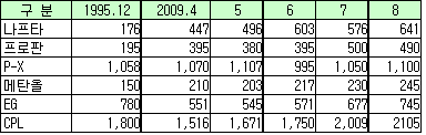 EG(Ethylene Glycol)는 중동 신규 플랜트의 생산 감소 및 아시아 플랜트의 가동중단으로 공급이 타이트해 10.1% 상승한 745달러를, CPL(Caprolactam)은 수급타이트로 상승세가 이어지면서 7.0% 올라 2105달러를 기록했다. <고우리 기자> 표, 그래프: | 석유화학제품의 수입가격 변화(2009.8) | <화학저널 2009/9/23> |