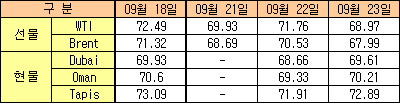 9월23일 WTI 2.79달러에 Brent 1.27달러 내려 … 두바이유는 상승