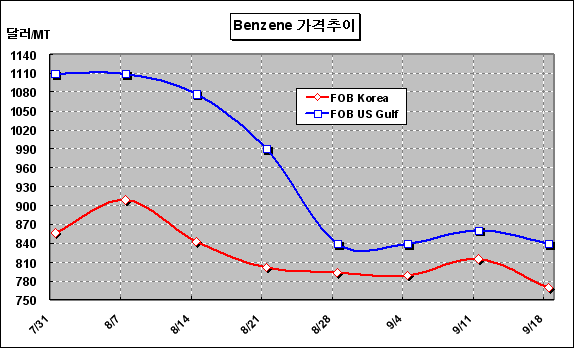 벤젠 가격은 9월 셋째 주에 FOB Korea 톤당 769달러로 46달러 급락했다.