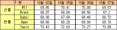 10월7일 WTI 1.31달러 내려 69.57달러 형성 … 두바이유는 68.72달러 10월7일 국제유가는 미국 석유제품 재고가 예상외로 증가하고 증시가 약세를 보인 영향으로 하락했다.석유공사에 따르면, 뉴욕상업거래소(NYMEX)의 WTI(서부텍사스 경질유) 선물유가는 배럴당 69.57달러로 1.31달러, Brent는 67.20달러로 1.36달러 상승했다. 두바이(Dubai)유 현물유가는 미국 달러화 약세 및 석유 재고가 감소소식이 뒤늦게 반영돼 0.24달러 상승한 68.72달러에 거래를 마감했다.
