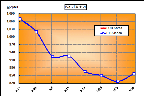 FOB Korea 857달러 형성 … 가격 저평가에 따른 소폭 상승 P-X(Para-Xylene) 가격이 소폭 상승했다.아시아 P-X 가격은 10월9일 전주대비 16.5달러 상승하며 FOB Korea 톤당 857달러, CFR China/China 톤당 876달러를 형성했다. P-X 가격이 톤당 900-920달러를 형성해도 다운스트림인 PTA(Purified Terephthalic Acid)의 수익성이 악화되지 않음에도 불구하고 800달러대를 유지하고 있어 가격이 낮게 평가받고 있다는 의견이 지배적으로 나타나고 있어 가격 현실화 차원에서 상승한 것으로 해석된다.