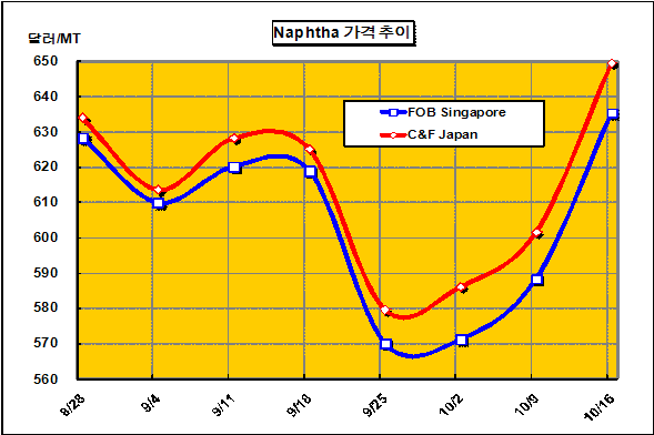 C&F Japan 650달러로 48달러 올라 … 중동공급 늘어 하락 불가피 나프타 가격은 10월 셋째 주에 C&F Japan 톤당 649-650달러로 48달러 상승했다.아시아 나프타(Naphtha) 가격은 국제유가가 WTI(서부텍사스 경질유) 기준 배럴당 76달러를 넘어선 영향을 받아 600달러대 중반으로 뛰어올랐다.