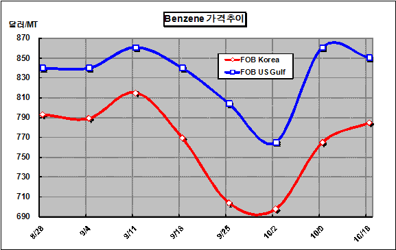 FOB Korea 784-785달러 형성 … BTX 가동률 감축 장기화도 한몫 벤젠(Benzene) 가격이 800달러 직전으로 올랐다.아시아 벤젠 가격은 10월16일 거래 급증으로 전주대비 20달러 상승해 FOB Korea 톤당 780달러를 형성했다. GS칼텍스가 Sabic에게 판매할 11월 하순물량의 거래가격을 당초 제시했던 FOB Korea 톤당 772달러에서 785달러로 인상함에 따라 가격상승이 촉발된 것으로 해석된다. 또 아시아 아로마틱(Aromatic) 시장의 가동률 감축 행진으로 가격상승에 힘을 실어주었고, 중국의 국경절 종료효과가 본격화되면서 수요회복이 빠르게 진행된 것도 영향을 끼쳤다.