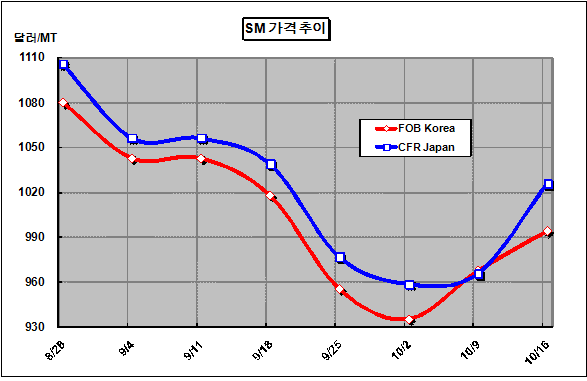 SM 가격은 10월 셋째 주에 FOB Korea 톤당 993-994달러로 27달러 올랐다.