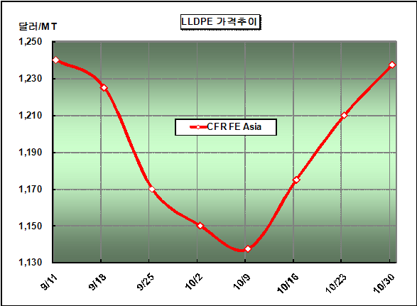 CFR FE Asia 1238달러로 28달러 상승 … 정기보수로 수급 타이트 LLDPE 가격은 10월 다섯째 주에 CFR FE Asia 톤당 1275-1280달러로 28달러 올랐다.아시아 LLDPE(Linear Low-Density Polyethylene) 가격은 중국 수요가 증가한 반면 정기보수로 수급타이트가 심화돼 1200달러대 중반으로 올라섰다. 타이완은 정기보수 일정으로 재고가 줄어든 상태에서 중국 및 동남아의 주문이 늘어나 아시아 가격상승을 주도하고 있다.