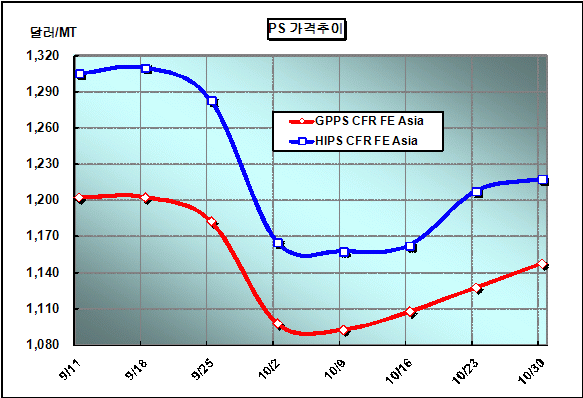 CFR FE Asia 1145-1150달러로 형성 … 가동률 85-90%로 상승 PS 가격은 10월 다섯째 주에 CFR FE Asia 톤당 1148달러로 20달러 상승했다.아시아 PS(Polystyrene) 가격은 동북아를 중심으로 가동률 조절이 홍수를 이룸에 따라 수급타이트가 유도돼 1150달러까지 올라섰다. 이에 따라 동북아시아는 PS 가동률이 85%, 동남아시아는 90% 수준으로 상승했다.