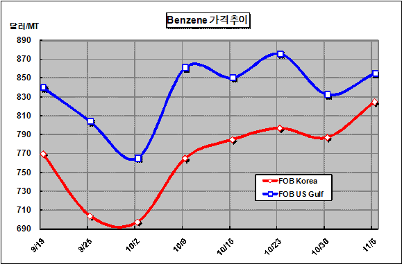 FOB Korea 823달러로 36달러 상승 … 아시아 수급타이트 심화추세 벤젠 가격은 11월 첫째 주에 FOB Korea 톤당 824-825달러로 36달러 상승했다.아시아 벤젠(Benzene) 가격은 국제유가가 다시 강세로 돌아서고 미국가격까지 850달러를 넘어선 영향으로 820달러를 돌파하는 호조를 나타냈다. 미국가격은 FOB US Gulf 갤런당 285센트 수준으로 톤당으로 환산하면 855달러에 달해 아시아 가격과 30달러 이상 벌어져 있다.