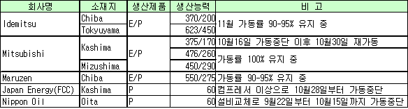 IdemitsuㆍMitsubishi 높은 가동률 유지 … 일부는 가동중단 일본의 올레핀(Olefin) 고공행진을 유지하고 있다.Idemitsu는 Chiba 소재 에틸렌(Ethylene) 37만톤, 프로필렌(Propylene) 20만톤 플랜트를 현재 90-95% 가동하고 있으며 Tokyuyama 소재 에틸렌 62만3000톤, 프로필렌 45만톤 플랜트 역시 90-95%의 가동률을 유지하고 있다. Mitsubishi도 높은 가동률을 유지하고 있다. Mitsubishi의 Kashima 소재 No.2 에틸렌 47만6000톤, 프로필렌 26만톤 플랜트는 가동률 100%를 유지하고 있으며 Mizushima 소재 에틸렌 45만톤, 프로필렌 29만톤 플랜트 역시 가동률 100%를 유지 중이다. Kashima 소재 No.1 에틸렌 37만5000톤, 프로필렌 17만톤 플랜트는 10월16일 가동중단에 들어갔으나 10월30일부터 재가동한 것으로 알려지고 있다. Maruzen 역시 Chiba 소재 에틸렌 55만톤, 프로필렌 27만5000톤 플랜트를 90-95%로 가동하고 있다.