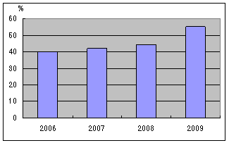 이에 Sekisui Chemical은 2008-09년 호조에 힘입어 시장점유율 확대에 박차를 가하고 있다. 중국 Hanzhou에서 건설중인 2개 라인은 예정대로 2009년 가동함으로써 중국시장에 대응하는 등 벨류체인 강화 및 생산체제 정비를 지속적으로 추진해나갈 방침이다. 표, 그래프: | Sekisui의 자동차 유리중간막 세계시장 점유율 변화 | Sekisui Chemical의 유리중간막 생산현황 | <화학저널 2009/11/24> |