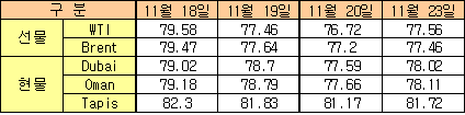 11월23일 WTI 0.09달러 올라 77.56달러 … 두바이유는 78.02달러 11월23일 국제유가는 미국 달러화 약세 및 증시 강세 등의 영향으로 상승했지만, 차익실현 매물의 출회로 상승폭이 제한됐다.석유공사에 따르면, 뉴욕상업거래소(NYMEX)의 WTI(서부텍사스 경질유) 선물유가는 배럴당 77.56달러로 .09달러, Brent는 77.46달러로 0.26달러 상승했다. 두바이(Dubai)유 현물유가는 전일대비 0.43달러 오른 78.02달러에 거래를 마감했다.