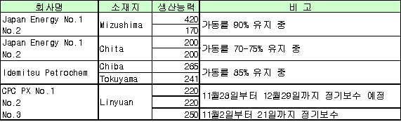 일본의 Japan Energy는 Mizushima 소재 No.1 42만톤 플랜트와 No.2 17만톤 플랜트의 가동률을 90%로 유지하고 있으며 Chita 소재 No.1, No.2 20만톤 플랜트는 가동률을 각각 70-75%로 유지하고 있는 것으로 알려지고 있다.