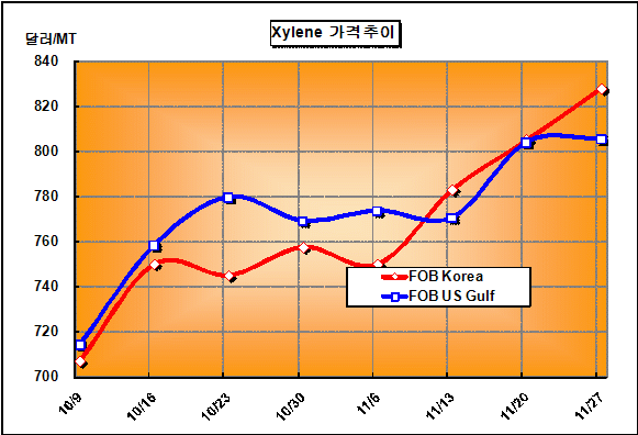 중국에서는 11월26일 솔벤트용 M-X 가격이 CFR China 톤당 845-850달러를 형성했으나 장 마감으로 실질적인 거래는 이루어지지 못했다. 동남아에서는 수요가 약세를 보이고 있어 거래량은 소폭에 머물고 있다. PCS는 23일 솔벤트용 M-X 700톤을 톤당 850달러에 내수시장에 거래하는데 그쳤으며 베트남에서는 톤당 870달러에 가격은 형성됐지만 거래가 이루어지지 않고 있다. <이명주 기자> 표, 그래프: | Xylene가격추이 | <화학저널 2009/12/3> |