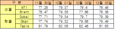 12월3일 WTI 0.14달러에 두바이유 0.31달러 내려 … Brent는 상승 12월3일 국제유가는 미국의 서비스 경기지표 부진에 따른 경기회복 지연 우려로 하락했다.석유공사에 따르면, 뉴욕상업거래소(NYMEX)의 WTI(서부텍사스 경질유) 선물유가는 배럴당 76.46달러로 전일대비 0.14달러 내렸으나 Brent는 78.36달러로 0.48달러 상승했다. 두바이(Dubai)유 현물유가는 미국의 원유 및 휘발유 재고가 증가하고 석유 수요가 급감한 영향이 뒤늦게 반영돼 0.31달러 내린 79.39달러에 거래를 마감했다.