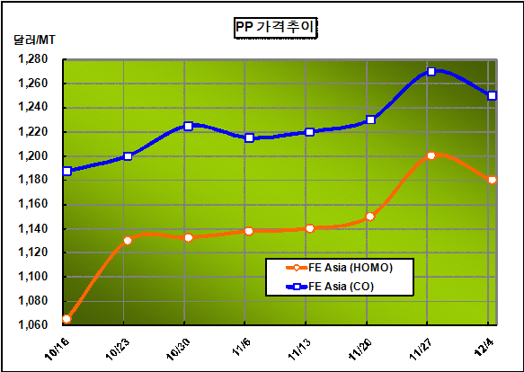 CFR FE Aisa 1179-1181달러 형성 … ASEAN 수입관세도 변수 PP 가격은 12월4일 전주대비 20달러 하락해 CFR FE Asia 톤당 1179-1181달러를 형성했다.아시아 PP(Polypropylene) 가격은 두바이월드가 590억달러에 달하는 부채의 상환을 6개월간 연기하겠다고 발표하고 수요가 침체되면서 하락세로 전환했다. 중동기업들이 PP 수출을 확대할 가능성이 높아지고 있기 때문이다. 프로필렌 유도제품인 2-EH(Ethylhexanol), AN(Acrylonitrile), PO(Propylene Oxide), 아크릴산(Acrylic Acid) 수요는 호조를 보이고 있으나 PP 수요는 침체되고 있다. 아시아 PP 가격은 Raffia/Injection 그레이드가 CFR FE Asia 톤당 1179-1181달러, IPP Film 및 BOPP 그레이드가 1199-1201달러, Block Copolymer 그레이드가 1249-1251달러를 형성했다.