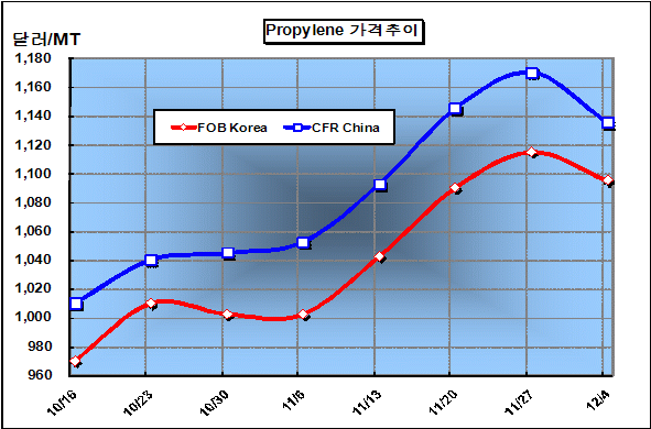 FOB Korea 1094-1096달러 형성 … 두바이사태 여파 PP 수요 침체 프로필렌 가격이 11월26일 전주대비 20달러 하락해 FOB Korea 톤당 1094-1096달러를 형성했다.아시아 프로필렌(Propylene) 가격은 두바이월드가 590억달러에 달하는 부채를 6개월간 상환 연기하겠다고 발표함에 따라 PP(Polypropylene) 수요가 침체되면서 하락세로 전환했다. 특히, PP는 Raffia/Injection 그레이드가 CFR China 톤당 1180달러로 마진이 악화돼 PP 플랜트의 가동률 감축이 불가피한 상태이다.