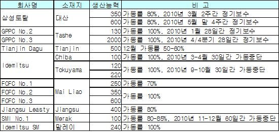 Idemitsu는 Chiba 소재 10만톤 플랜트를 100% 가동하고 있으나 2010년 3-4월 30일간 가동중단할 전망이고, Tokuyama 소재 12만톤, 22만톤 플랜트는 2010년 9-10월 30일간 가동중단할 것으로 예상된다.