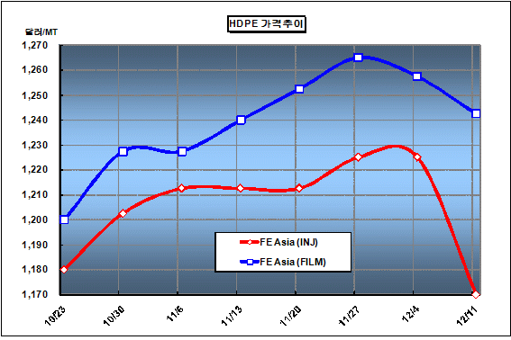 HDPE 가격은 12월9일 55달러 하락해 CFR FE Asia 톤당 1165-1175달러를 형성했다.