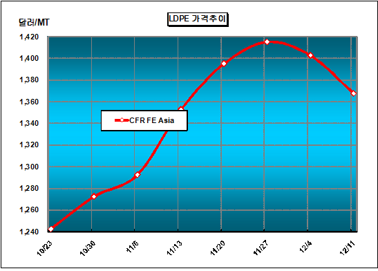 CFR FE Asia 1365-1370달러 형성 … Tianjin·Panjin 플랜트 가동 임박 LDPE 가격은 12월 둘째 주에 CFR FE Asia 톤당 1365-1370달러로 35달러 하락했다.아시아 LDPE(Low-Density Polyethylene) 가격은 공급에 여유가 없음에도 불구하고 수요가 약세로 돌아서고 국제유가까지 하락해 1400달러가 붕괴됐다. 중국에서 Sinopec Tianjin Petrochemical과 Panjin Petrochemical이 신규 플랜트를 가동하는 것도 약세 요인으로 작용했다.