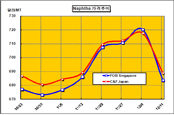 C&F Japan 686-692달러로 29달러 하락 … 미국 수출가격 크게 하락 나프타 가격은 12월 둘째 주에 C&F Japan 톤당 686-692달러로 29달러 급락했다.아시아 나프타(Naphtha) 가격은 WTI(서부텍사스 경질유)가 배럴당 70달러 아래로 하락함에 따라 미국의 아시아에 대한 나프타 수출가격이 떨어짐으로써 700달러가 무너졌다. 미국은 WTI에 연동해 나프타 수출가격을 결정하고 있다.