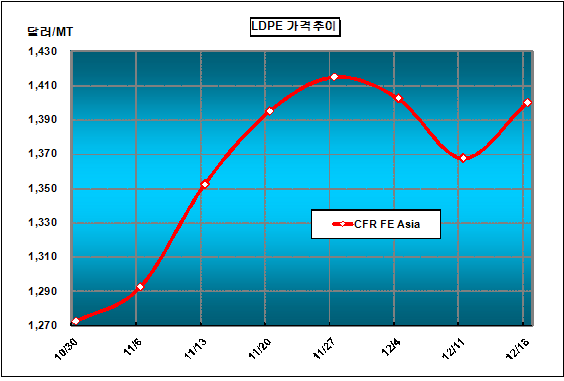 CFR FE Asia 1398-1402달러 형성 … 계절적 성수기에 유가 강세 겹쳐 LDPE 가격은 12월 셋째 주에 32달러 상승해 CFR FE Asia 톤당 1398-1402달러를 형성했다.아시아 LDPE(Low-Density Polyethylene) 가격은 계절적 성수기와 국제유가 강세, 에틸렌(Ethylene) 상승에 따른 중국의 구매수요 등이 맞물리며 1400달러에 재입성했다. 특히, 중국에서 농업용 필름의 수요가 회복되고 있고, 중동기업들이 재고 부족으로 Spot 판매에 나서지 못하고 이란의 정세 불안정으로 공급부족이 심화되고 있는 것도 LDPE 가격 상승에 영향을 미쳤다.