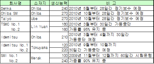 DenkaㆍTSMCㆍIdemitsu 정기보수 홍수로 … SMI는 정상가동 2010년에는 아시아 SM(Styrene Monomer) 플랜트의 정기보수와 가동중단이 연이어 공급과잉이 예상보다 심각하지 않을 가능성이 엿보이고 있다.Denka는 Chiba 소재 24만톤 플랜트를 현재 80% 가동하고 있지만 2010년 5월부터 28일간 정기보수를 단행하고, Chiba SM은 Chiba 소재 27만톤 플랜트를 2010년 10월부터 28일간 정기보수에 들어갈 계획이다. Taiyo는 Ube 소재 37만톤 플랜트를 70%로 가동하고 있으나 2010년 9월부터 42-45일간 정기보수를 실시한다. TSMC의 Lin Yuan 소재 18만톤 플랜트는 2010년 3월부터 30일간 정기보수에 들어간다. Idemitsu의 Tokuyama 소재 No.1 12만톤 플랜트와 No.2 22만톤 플랜트는 2010년 9월부터 10월까지 30일간 가동중단에 들어가며, Chiba 소재 21만톤 플랜트는 2010년 3월부터 4월까지 30일간 가동중단을 실시할 예정이다.