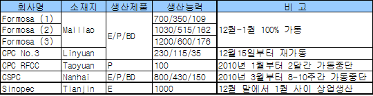 CSPC는 3월부터 8-10주간 가동중단 … Formosa는 올레핀 풀가동 중국과 타이완의 올레핀(Olefin) 가동률이 상반되게 나타나고 있다.CPC는 Linyuan 소재 No.3 에틸렌(Ethylene) 23만톤, 프로필렌(Propylene) 11만5000톤, 부타디엔(Butadiene) 3만5000톤 크래커를 12월15일부터 재가동했고, Taoyuan 소재 프로필렌 10만톤 플랜트는 2010년 1월부터 2달간 가동중단할 예정이다. CSPC는 Nanhai 소재 에틸렌 80만톤, 프로필렌 43만톤, 부타디엔 15만톤을 2010년 3월부터 8-10주간 가동중단할 예정이다.