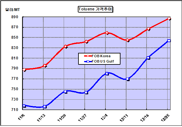 FOB Korea 886-887달러 형성 … 원료코스트 상승에 수요급증 영향 톨루엔(Toluene) 가격상승이 지속되고 있다.아시아 톨루엔 가격은 12월24일 전주대비 20달러 오르며 FOB Korea 톤당 886-887달러를 형성했다. 톨루엔 가격상승세는 중국의 벤젠(Benzene) 수요 증가와 국제유가 상승에 따른 벤젠 가격 상승이 맞물리면서 상승세를 유지하고 있다. 벤젠 가격은 12월24일 38달러 올라 톤당 1008달러를 형성했다. SK에너지의 하루 생산량이 4만5000배럴에 달하는 톨루엔 플랜트의 가동중단도 영향을 미치고 있다.
