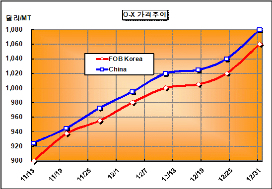 FOB Korea 1055-1065달러 형성 … 원료가격 강세에 수급타이트 영향 O-X(Ortho-Xylene) 가격이 상승세를 유지하며 1000달러대를 고수하고 있다.아시아 O-X 가격은 2009년 12월31일 전주대비 톤당 40달러가 오르며 FOB Korea 톤당 1055-1065달러를 형성했다. O-X의 가격상승세는 원료가격이 고공행진을 유지하고 있으며, 동북아의 생산기업들이 수요증가 대비 공급을 증가시키지 않으면서 수급타이트가 발생하고 있기 때문이다. 중국 일부에서는 12월25일 1월 인도물량 3000톤을 톤당 1065달러에 거래했으나 12월31일에는 톤당 1080달러에 거래된 것으로 알려지고 있다.