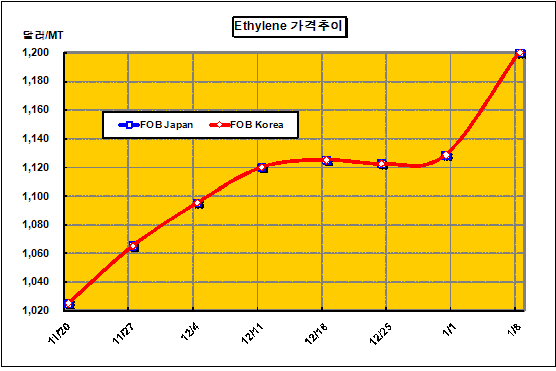 FOB Korea 1199-1201달러 형성 … Spot 공급 동남아 집중 에틸렌 가격은 1월8일 FOB Korea 톤당 1200달러로 78달러 상승했다.아시아 에틸렌(Ethylene) 가격은 수요 호조와 2월 공급물량 부족으로 수급타이트가 강화돼 1200달러를 돌파했다. Formosa가 2월 재고 확보에 난항을 겪으면서 플랜트 가동률이 90%에 그치고, Spot 공급이 동남아로 집중돼 공급부족이 심화됐으며, 유통기업들의 구매수요 증가에 힘입어 1200달러에 안착할 가능성이 높아지고 있다.