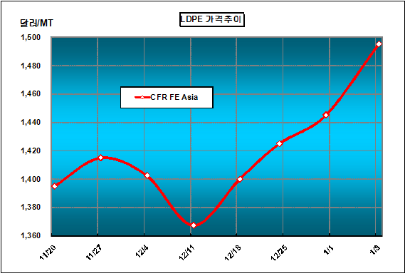 LDPE 가격은 1월 둘째 주에 CFR FE Asia 톤당 1495달러로 50달러 상승했다.