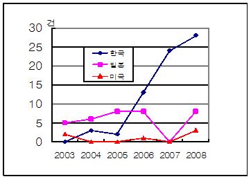 TSV 기술은 회로의 집적도, 동작 속도, 전력 사용량 및 제조비용을 감축 효과가 기대돼 IBM과 Intel에서 다중 프로세서 코어를 가진 칩 개발에 적용하고 있다. 낸드플래시 메모리 분야의 경쟁자인 삼성전자와 도시바(Toshiba)도 TSV 기술을 이용한 3차원 셀의 개발경쟁이 치열한 상황이다. 특허청에 따르면, 3차원 구조의 칩 개발을 위한 TSV 관련 특허출원은 2003-08년 111건이 출원됐는데 2003년에는 7건에 그쳤던 것이 2008년 39건으로 꾸준한 증가세를 나타내고 있다. 한국이 63%, 일본이 32% 그리고 미국이 5%를 차지하고 있어 한국이 출원건수의 비율에서 우위를 점하고 있는 것으로 나타났다. 다만, 한국은 2006년에 들어서야 본격적으로 출원하고 있어 3차원 셀의 기반기술 선점이 경쟁국에 비해 다소 늦어진 것으로 지적됐다. 그러나 TSV 기술의 태동시기가 비교적 오래되지 않았고, TSV 기술의 파급효과에 비해 현재까지의 특허출원 규모가 작은 점을 고려하면 국내 반도체기업에도 기회가 남아있는 것으로 보여 반도체 강국의 위상에 걸맞게 관련기업들의 지속적인 기술 개발노력이 요구되고 있다. <고우리 기자> 표, 그래프: | 반도체 다층 직접화 기술 특허출원 동향 | <화학저널 2010/1/12> |