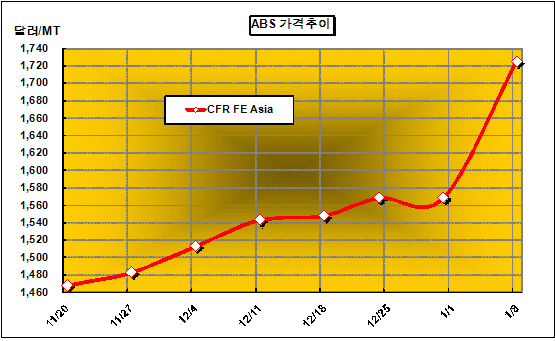 CFR FE Asia 1724-1726달러 형성 … 금호·제일모직 풀가동 체제 ABS 가격은 1월 첫째 주에 CFR FE Asia 톤당 1725달러로 157달러 폭등했다.ABS(Acrylonitrile Butadiene Styrene) 가격은 SM(Styrene Monomer) 가격이 1325달러로 급등하는 등 원료 코스트가 상승해 1700달러를 돌파했다. 부타디엔(Butadiene)은 CFR China 톤당 1905달러로 상승세를 지속하고 있으며, AN(Acrylonitrile)도 14주 동안 최고치인 CFR China 톤당 1800달러를 형성했다.