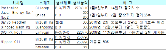 Japan Energy에 Pertamina 정기보수 … Nippon Oil은 가동률 80% 아시아 BTX 생산기업들의 정기보수 및 가동중단이 이어지고 있다.아시아 아로마틱(Aromatics) 가격이 강세를 유지하고 있는 가운데 생산기업들의 가동률이 하락세를 보임에 따라 아시아 수요기업들의 압박은 심화될 것으로 예상된다. Japan Energy의 Chita 소재 P-X(Para-Xylene) No.1과 No.2 각각 20만 플랜트는 1월1일부터 2월 중순까지 45일간 정기보수에 들어갔다. Pertamina의 Cilacap 소재 P-X 27만톤, 벤젠(Benzene) 11만톤 플랜트는 1월8일부터 14일간 정기보수를 실시하고 있다. Sanyo Petchem의 Mizushima 소재 벤젠 30톤 플랜트는 2010년 2월 중순부터 2달간 정기보수를 실시할 계획이다. 정기보수와 함께 가동중단도 이어지고 있다. Sinopec Maoming의 Guangdong 소재 BTX 60만톤 플랜트는 2009년 12월31일부터 한달간 가동중단에 들어갔다. CPC PX의 Linyuan 소재 No.1 P-X 22만톤, O-X(Ortho-Xylene) 7만톤 플랜트는 2009년 11월26일부터 가동중단 중이며 2월에 재가동에 들어갈 것으로 알려지고 있다.