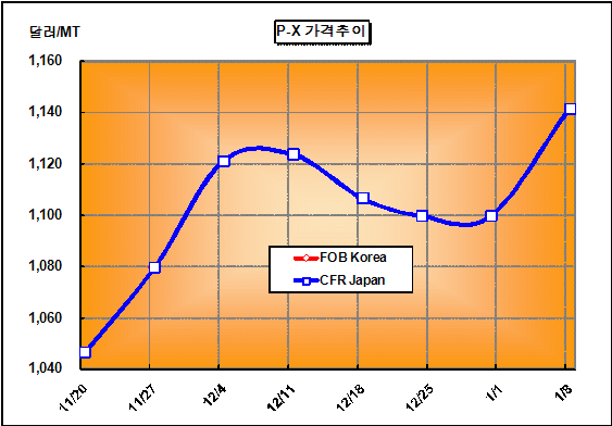 FOB Korea 1141-1142달러 형성 … 비공개 수요 영향 가격상승 P-X(Para-Xylene) 가격은 1월8일 24달러 상승하며 FOB Korea 톤당 1141-1142달러를 형성했다.P-X 가격 변화는 계약수요가 일정하게 유지되지 못하고 있는 반면 Spot 수요가 늘어나고 있기 때문으로 해석된다.