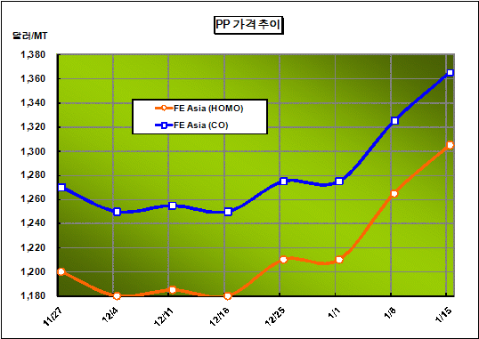 CFR FE Aisa 1300-1310달러 형성 … Haldia는 1월21일 가동중단 PP 가격은 1월13일 CFR FE Asia 톤당 1305달러로 40달러 상승했다.아시아 PP(Polypropylene) 가격은 국제유가가 70달러대로 하락했음에도 불구하고 원료코스트 강세와 중국 수급타이트의 영향으로 1300달러를 돌파하며 강세를 이어나갔다. 특히, 한국과 일본, 타이완의 7개 에틸렌(Ethylene) 크래커가 정기보수로 가동을 중단함에 따라 2월부터 6월까지 프로필렌 수급타이트가 예상된다.