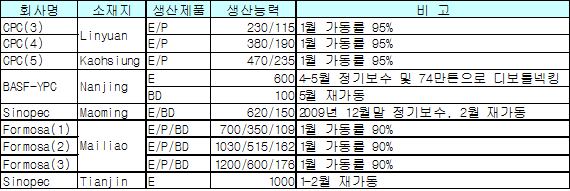 4월 정기보수 중 74만톤 증설 … Sinopec은 에틸렌 100만톤 가동 예정 중국의 올레핀 정기보수 계획이 줄을 잇고 있다.BASF-YPC는 Nanjing 소재 에틸렌(Ethylene) 60만톤 크래커를 4월 가동중단하고, 74만톤으로 증설할 계획이다. Sinopec은 2009년 12월 정기보수에 들어간 Maoming 소재 에틸렌 62만톤, 부타디엔(Butadiene) 15만톤을 2010년 2월 재가동할 예정이다.