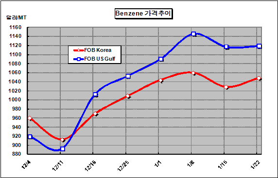 FOB Korea 1047-1048달러 형성 … 미국 수요 증가 따른 심리적 영향 가파른 상승세를 보여온 벤젠(Benzene) 가격이 안정세에 접어들었다.벤젠 가격은 1월22일 FOB Korea 톤당 1047-1048달러로 19달러 상승했다. 아시아 벤젠 가격은 미국 수요가 증가함에 따라 심리적 영향으로 소폭 상승했다. 아시아의 미국 수출은 2009년 12월 3만-4만톤에 이르렀고, 2010년 1-2월에도 최소 5만1000톤에 달할 것으로 예상되고 있다. 국내 수출량도 2010년 3월에는 9000-1만2000톤에 달할 것으로 전망되고 있다.