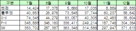 SM은 7월 35만3702톤에서 8월 28만7387톤으로 18.7% 감소한 이후 9월에는 36만3346톤으로 26.4% 증가했으나 10-11월에는 다시 감소세를 나타내다가 12월에 다시 37만1613톤으로 24.7% 늘어났다.