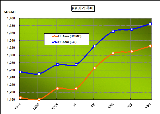 PP 가격은 1월27일 CFR FE Asia 톤당 1325달러로 15달러 상승했다.