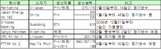Japan Energy도 Chita 소재 P-X No.1과 No.2 20만톤 플랜트를 1월1일부터 2월 중순까지 45일간 정기보수하고 있다.