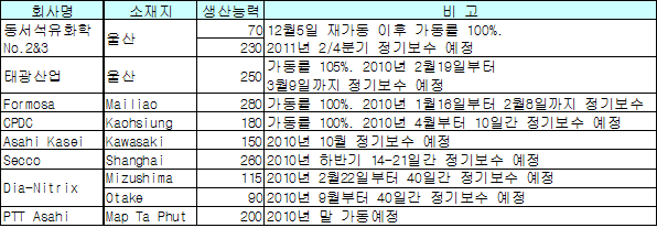 한편, 정기보수가 줄을 이을 전망이다. 태광산업은 울산 소재 25만톤 플랜트를 2010년 2월19일부터 3월9일까지 정기보수할 예정이며, 동서석유화학은 2011년 2/4분기에 울산 소재 No.2 7만톤 플랜트와 No.3 23만톤 플랜트의 정기보수를 계획중이다. Formosa의 Mailiao 소재 28만톤 플랜트는 2010년 1월16일부터 2월8까지 정기보수에 들어갔다. Dia-Nitrix은 Mizushima 소재 11만5000톤 플랜트를 2010년 2월22일부터 40일간, Otake 소재 9만톤 플랜트는 2010년 9월 40일간 정기보수할 예정이다. CPDC는 역시 Kaohsiung 소재 18만톤 플랜트를 2010년 4월10일부터 정기보수할 계획이다. <고희진 연구원> 표, 그래프: | 아시아 AN 플랜트 가동현황(2010) | <화학저널 2010/2/2> |