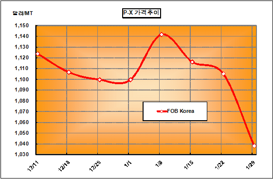 FOB Korea 1038달러로 52달러 하락 … M-X와의 스프레드 145달러 P-X(Para-Xylene) 가격이 내리막길을 걷고 있다.P-X 가격은 1월29일 전주대비 52달러 하락해 FOB Korea 톤당 1038달러를 형성했다. P-X 시장은 중국의 긴축정책 실시 우려와 유가 하락으로 1월25-29일 사이 거래가 잠잠했다. 2월 ACP(아시아 계약가격)를 앞두고 구매를 연기함에 따라가 P-X Spot 가격이 하락세를 이어가고 있으며, 현재 1월의 APC보다 35달러 낮은 가격을 형성하고 있어 2월 ACP도 낮게 형성될 가능성이 큰 것으로 판단된다.