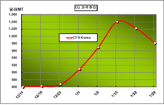 CFR China 979-983달러 형성 … 신규 플랜트 가동 본격화 MEG 가격이 1월22일 CFR China 톤당 979-983달러로 전주대비 40달러 하락했다.아시아 MEG(Monoethylene Glygol) 가격은 중국 정부의 금융긴축정책 시행에 따른 폴리에스터(Polyester) 수요 감소에 대한 우려감이 확산되면서 하락한 것으로 파악된다. 하지만, 시장 관계자들은 MEG 하락에 대해 낙관적 전망을 내놓고 있어 귀추가 주목된다. 2009년에는 중국의 춘절연휴 이후 수요가 급증해 수급타이트가 발생했기 때문으로 앞으로 중국내 MEG 플랜트 가동이 본격화될 것으로 예상하고 있다.